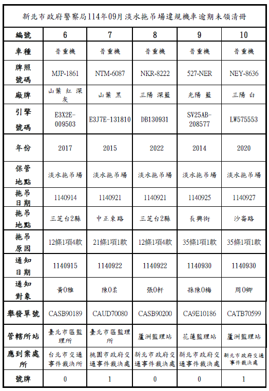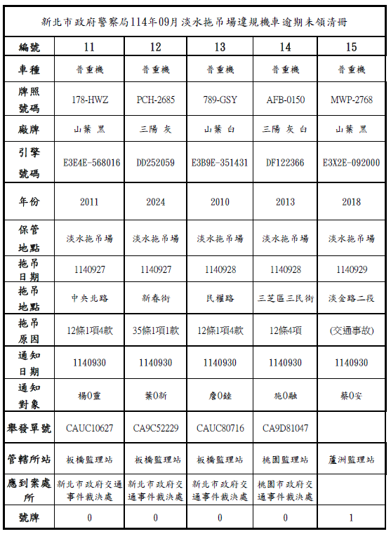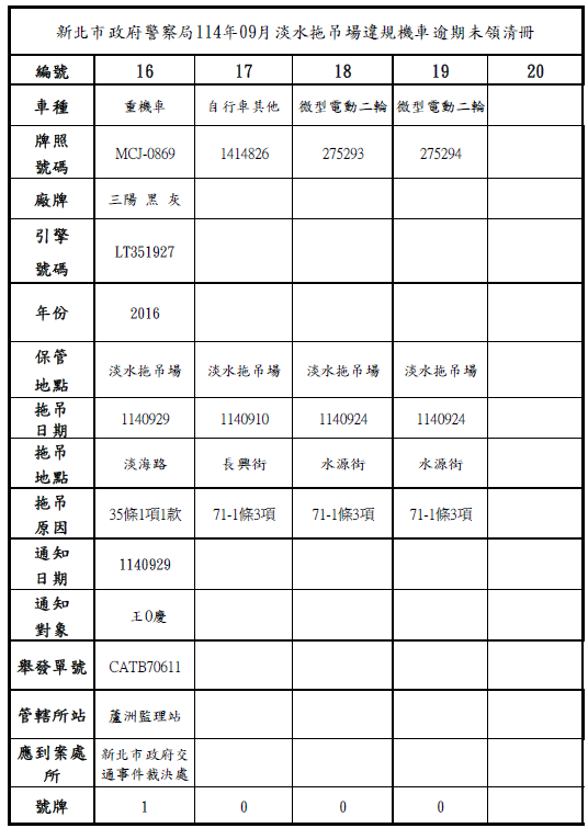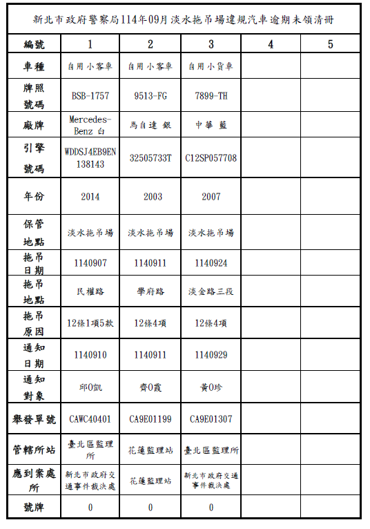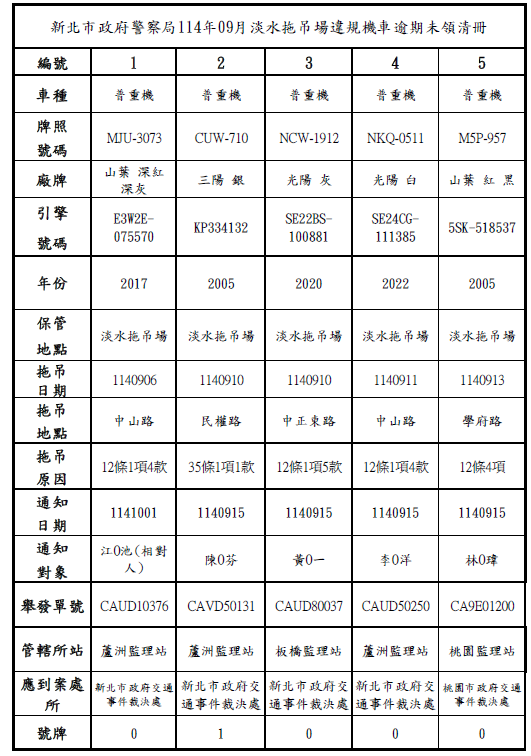 新北市政府警察局淡水分局114年9月份以前取締違反道路交通管理處罰條例移置保管逾期未領回汽、機車輛,經公告後仍無人認領之車輛,將予以拍賣清理。 |